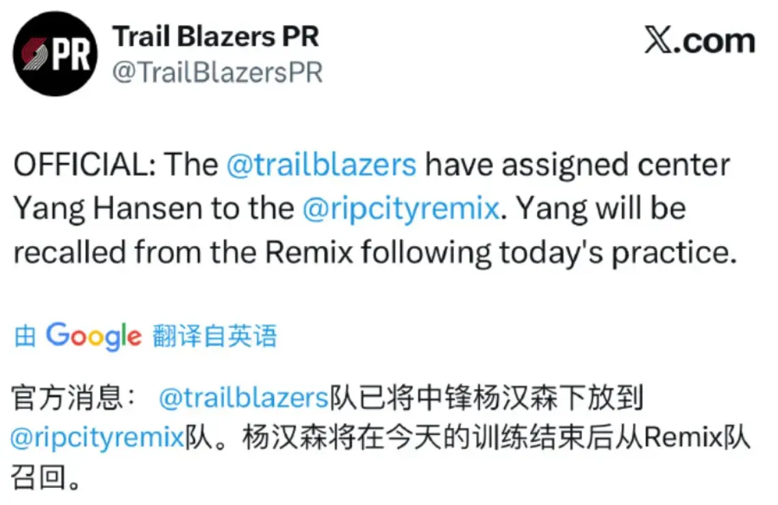 NBA方面在今天传来了一个消息:波特兰开拓者队再次决定将杨瀚森下放到NBA发展联盟的撕裂之城混音队参加合练创利配资,并且会在今天的训练结束之后将其召回。